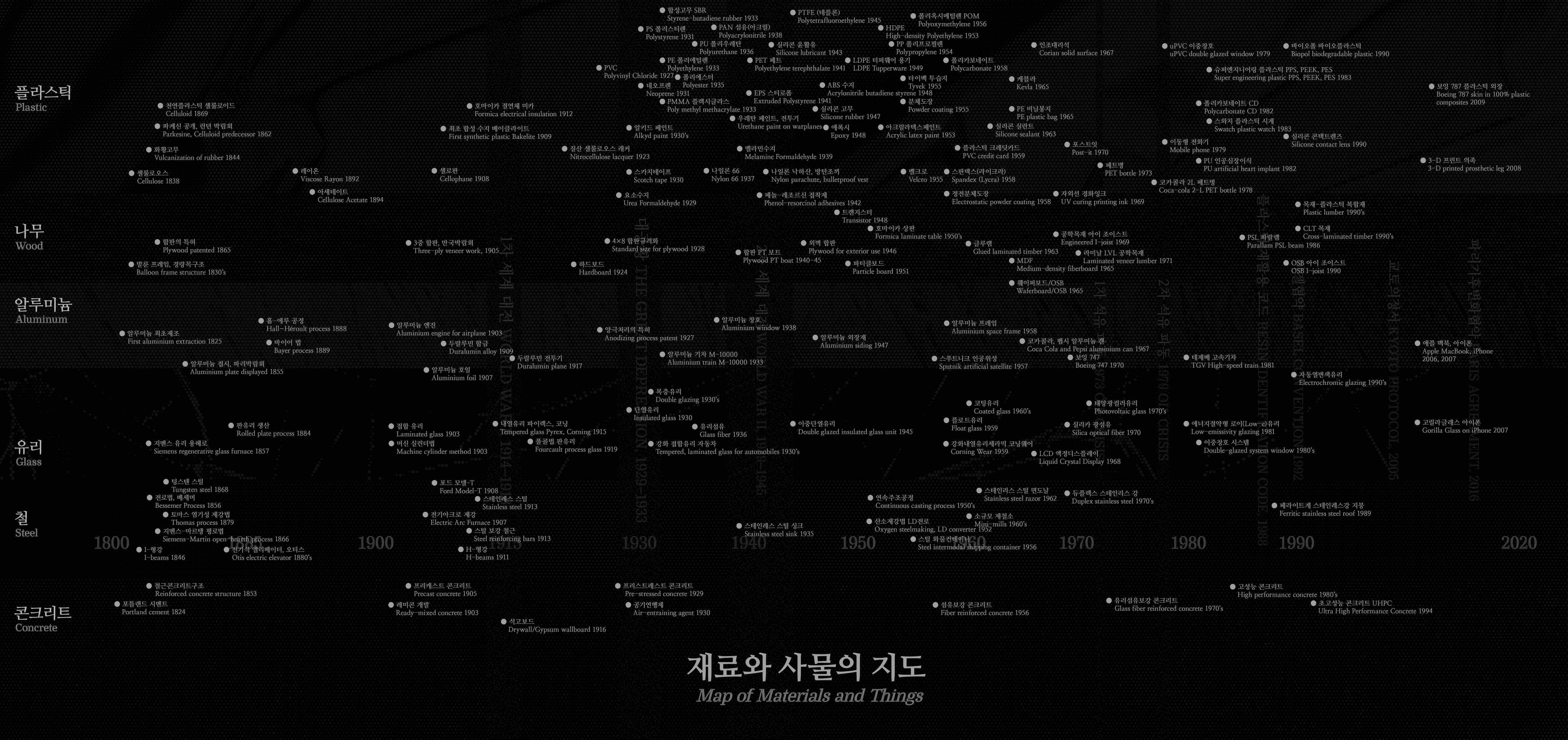 현재 우리가 사용하고 있는 건축자재는 대부분 대량생산과 표준화가 이루어진 20세기 동안 그 틀이 완성되었다. ‘건축자재산업지도’는 콘크리트, 철, 유리 등을 포함하는 대표적 건축재료와 관련 자재의 역사를 개괄적으로 살펴보고, 재료별 주요 물질, 제품, 자재, 사건, 건축물을 나열하여 자재 산업의 연결망을 한눈에 볼 수 있게 제작되었다. 재료별로 다른 발전의 속도와 시기, 서로 영향을 주고받는 물질과 사건을 짚어본다.