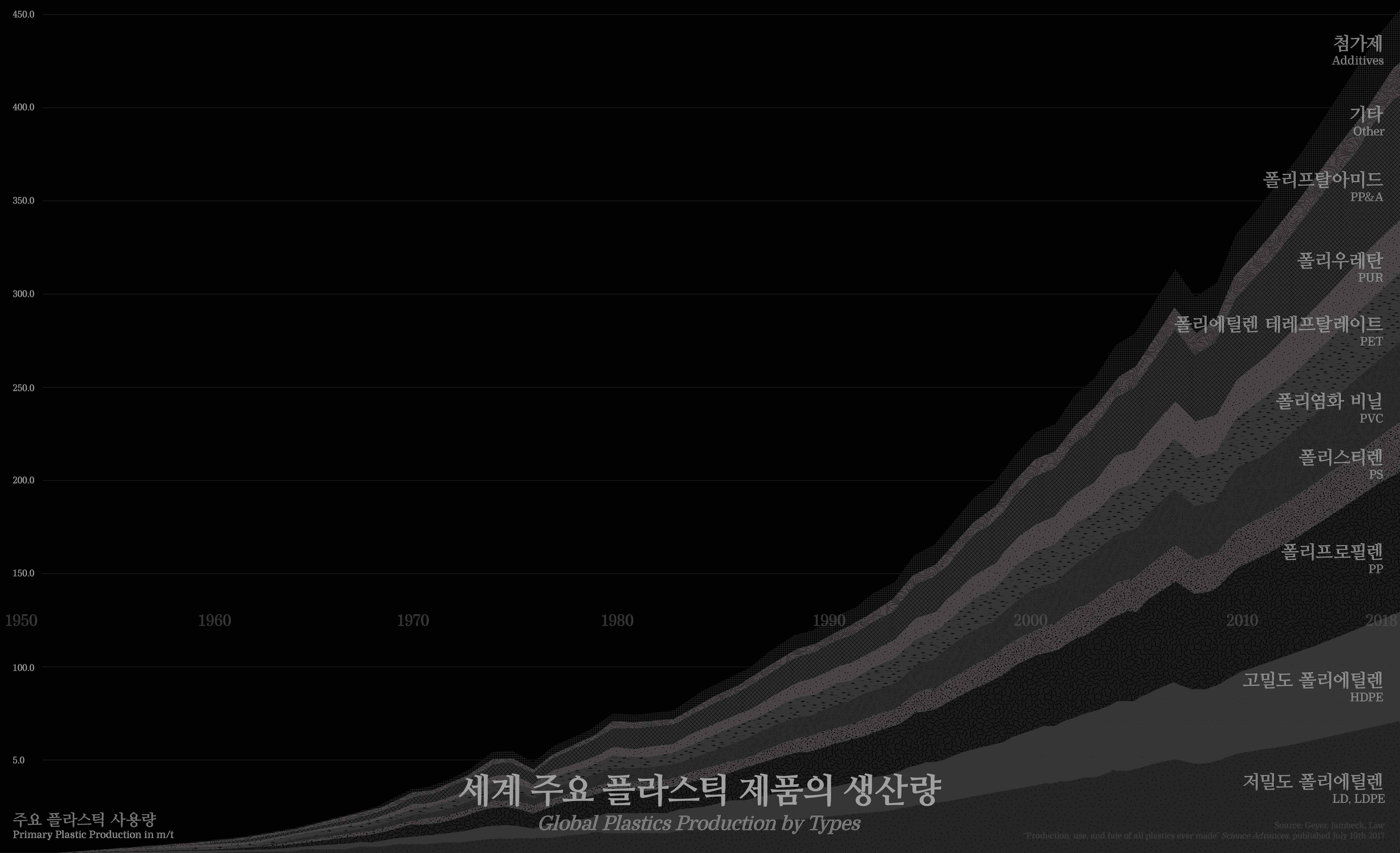 1930년대에 들어서 집중적으로 개발된 플라스틱은 2차 대전이라는 거대한 실험공간을 거쳐 전쟁 이후 본격적으로 대중에게 보급되기 시작하였다. 20세기 중, 후반부터 플라스틱의 생산량은 급격히 증가하기 시작하였는데 다양한 유형의 플라스틱 생산이 용이해졌고 일회용품, 포장, 의료, 전기, 건축 등 이들을 적용하는 분야와 산업이 확장된 것과 깊은 연관성이 있다고 볼 수 있다.